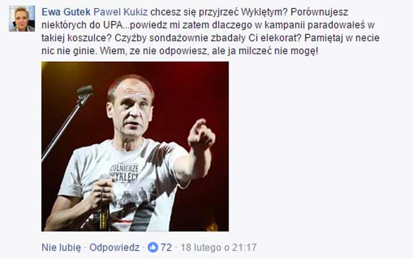 Paweł Kukiz na swoim profilu na Facebooku zaapelował, by – chcąc zweryfikować podejście Ukraińców do UPA – jednocześnie „rzetelnie przyjrzeć się Żołnierzom Wyklętym”. Ten skandaliczny (w moim odczuciu) jest szeroko komentowany we wszystkich mediach i (niestety) bardzo mocno wpisuje się w retorykę „Gazety Wyborczej” w związku z kultem żołnierzy wyklętych w Polsce. Za wszelką cenę próbuje się umniejszyć zasługi i oddaje tych bohaterskich Polaków, którzy poświęcali swoje życia dla walki o wolną ojczyznę.